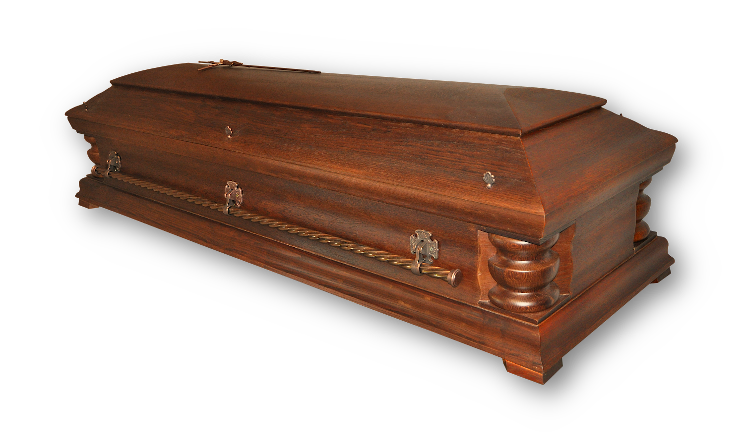 Ponieważ dbałość o szczegóły to nasz priorytet, trumna posiada solidne okucia oraz ozdobne uchwyty. Wszystkie te elementy idealnie komponują się z ciepłą barwą dębu. Na wieku umieściliśmy klasyczny krzyż, który stanowi wyraz wiary i nadziei. Każdy element metalowy dobraliśmy tak, aby współgrać z estetyką sarkofagu.